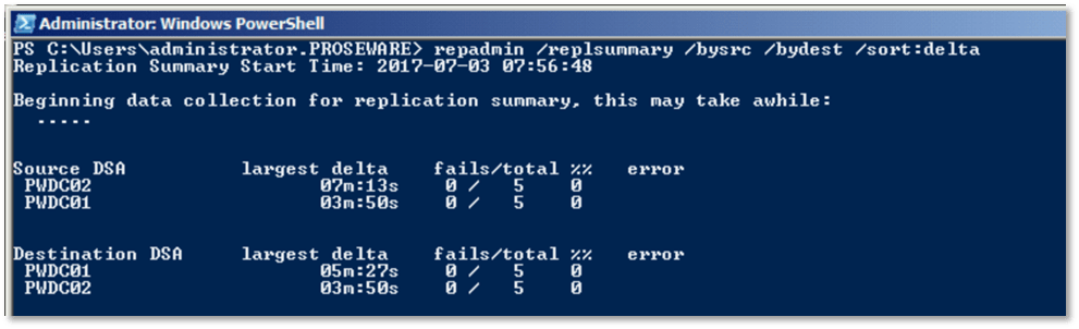 As seen in the screenshot below repadmin /replsummary will give statistics for replication with replication partners. The output also lists any errors that were encountered with replication. This is useful for getting an overview of any replication issues the DC is having.