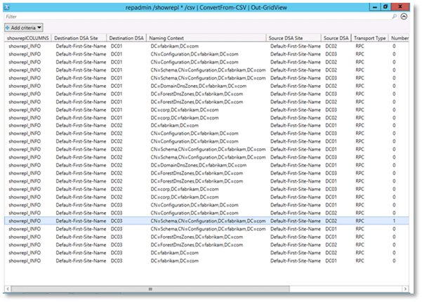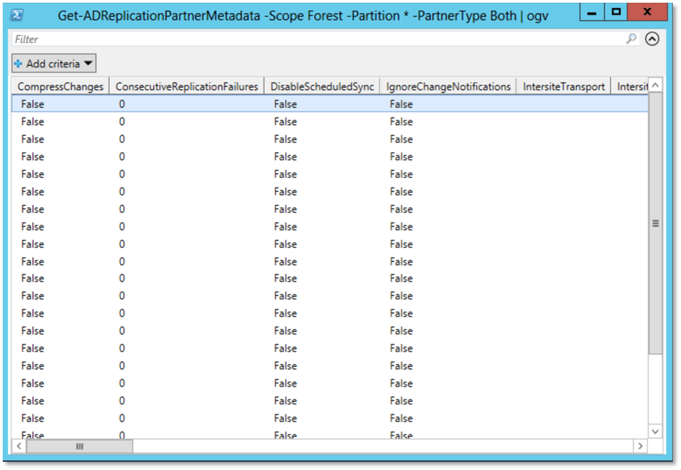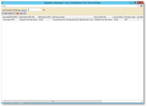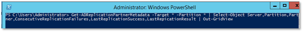 Here is another example of the usefulness of using PowerShell over repadmin. In this example I take the output of Get-ADReplicationPartnerMetadata then passing it through Select-Object so that we can then limit what objects are presented in GridView.