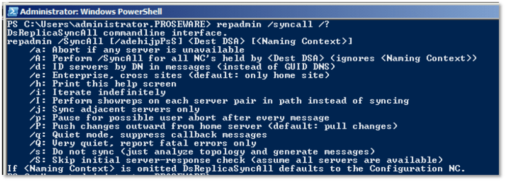 | Repadmin /syncall <DC> | Synchronizes a specified domain controller with all replication partners. |