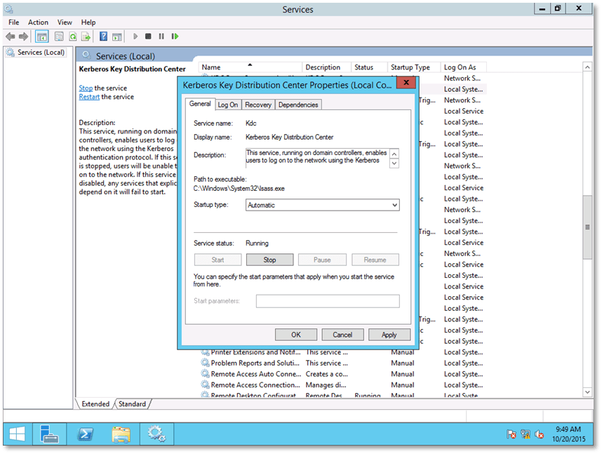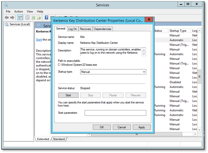 Step 10: Set the KDC service to Automatic, Start the service and click OK.