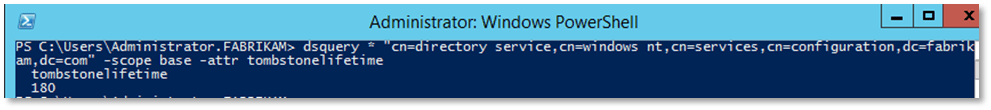 Run the following command: dsquery * “cn=directory service,cn=windows nt,cn=services,cn=configuration,<Forest DN>” –scope base –attr tombstonelifetime