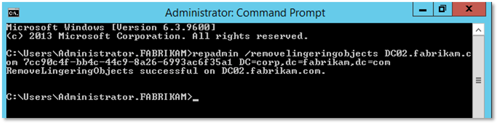 | Repadmin /removelingeringobjects <Dest_DC_List> <Source DC GUID> <NC> [/ADVISORY_MODE] | Uses an authoritative domain controller to compare the directory of a domain controller (destination) that is suspected of having lingering objects against the directory of a domain controller (source) that is designated as a reference source for up-to-date values for the domain of the destination. When the advisory mode parameter is used, this command provides a list of found lingering objects. When the advisory mode parameter is not used, this command removes lingering objects from the destination domain controller. |