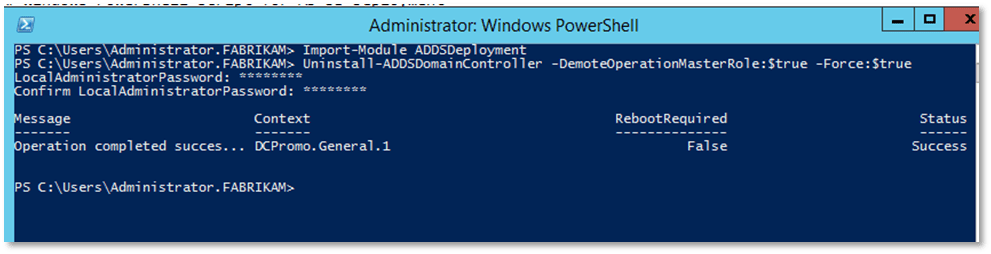 Step 2: Run: Uninstall-ADDSDomainController –DemoteOperationMasterRole:$true –Force:$true