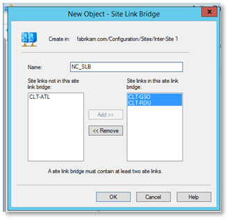 Add at least two sites to the Site Link Bridge, give it a Name, and click OK
