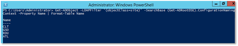 Step 1: Run the following command in a PowerShell Console: Get-ADObject –LDAPFilter ‘(objectClass=site)’ –SearchBase (Get-ADRootDSE).ConfigurationNamingContext –Property Name | Format-Table Name