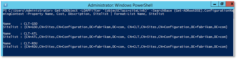 Step 2: In another PowerShell Console run: Get-ADObject –LDAPFilter ‘(objectClass=sitelink)’ –SearchBase (Get-ADRootDSE).ConfigurationNamingContext –Property Name, Cost, Description, Sitelist | Format-List Name, Sitelist