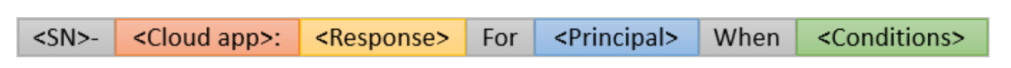 Implement a naming convention for conditional access polices. The recommended naming convention is: <Sequence Number><Cloud App><Response>For<Principal>When<Conditions>.