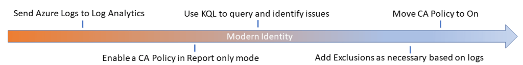 One thing to consider to ease the implementation of Conditional Access Policies is the use of Log Analytics and KQL. The first step is to move your Azure AD logs to Log Analytics. Then you can start using Kusto Query Language (KQL) to filter the logs to find any potential issues, such as service accounts which may not work well when interrupted by a required actions such as MFA, that is imposed by a Conditional Access Policy. However, prior to doing this you will need to create the Conditional Access Policy in Report only mode. Then based on the analysis of the logs you may decide to add exclusions to your policy. Then once you have added the appropriate exclusions you can change the policy to the On state.
