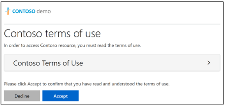 Terms of use allow you to present an Acceptable Use policy or notice to the user. The user then must acknowledge the text before they can continue to the application. Terms of use are used to present a written policy to the user, prior to the user accessing the application. The Terms of use can be a block of text or for longer policies a PDF file can be displayed to the user.