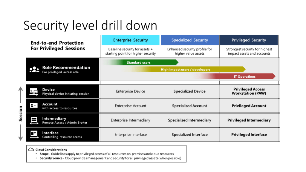 As seen in the graphic below, devices are logically separated into 3 categories: Enterprise Security, Specialized Security, and Priviledged Security. The Enterprise Security would be an ordinary users workstation, Specialized Security would be for a user that has additonal privileges or access, and Privledged Security would be for a user that uses a Priviledged account to perform administration, or has access to very sensitive data.