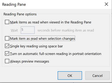 If using the Outlook client, go to File then Options. Then click Advanced. Then click on Reading Pane…