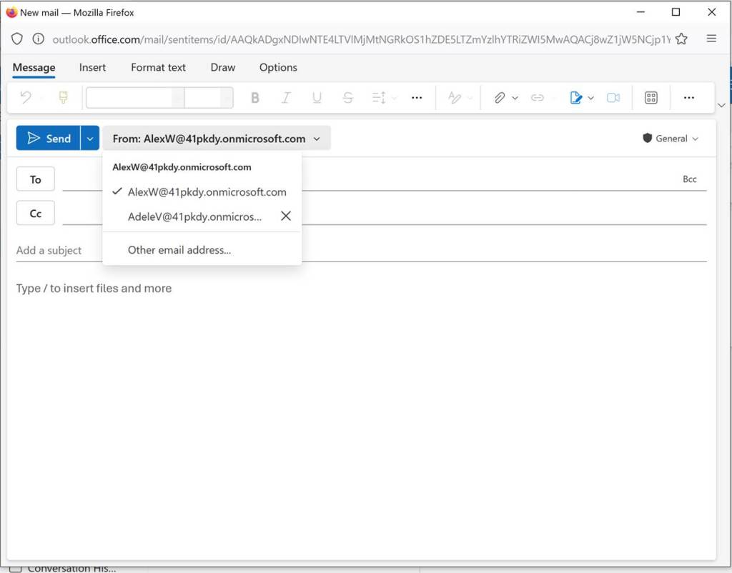 If using the full Outlook client the steps would be (no screenshot) to open a new email. Then go to Options and then under Show Fields select From.