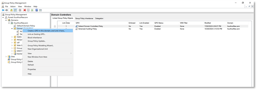 Step 1: Open the Group Policy Management Console (GPMC.msc) as a user that can create new GPOs and link them to the Domain Controllers container.