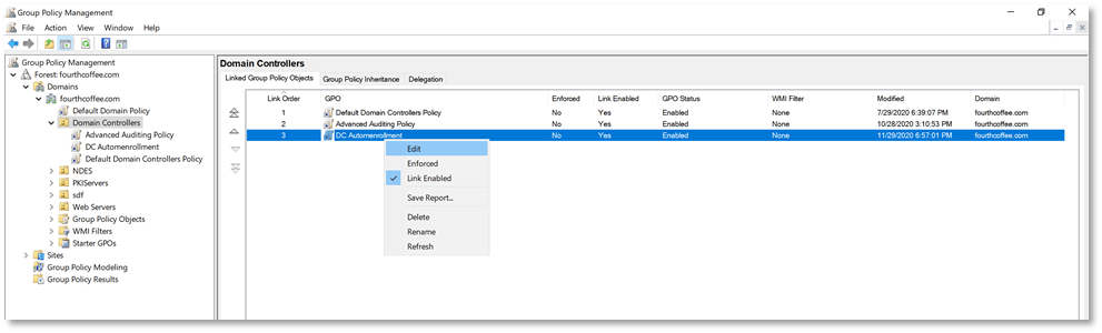 The steps below can be used to implement Autoenrollment for Domain Controllers. This walkthrough covers creating a new GPO on the Domain Controllers container.