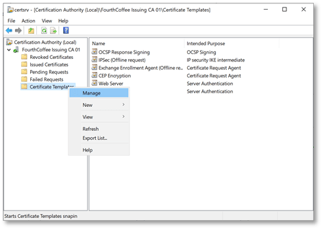 Step 3: Right-click on Certificate Templates and select Manage from the context menu