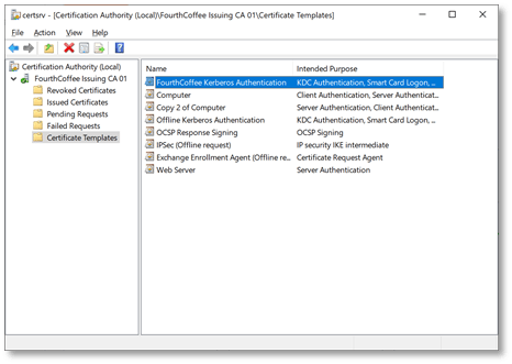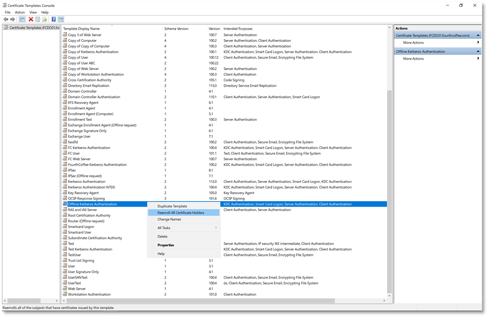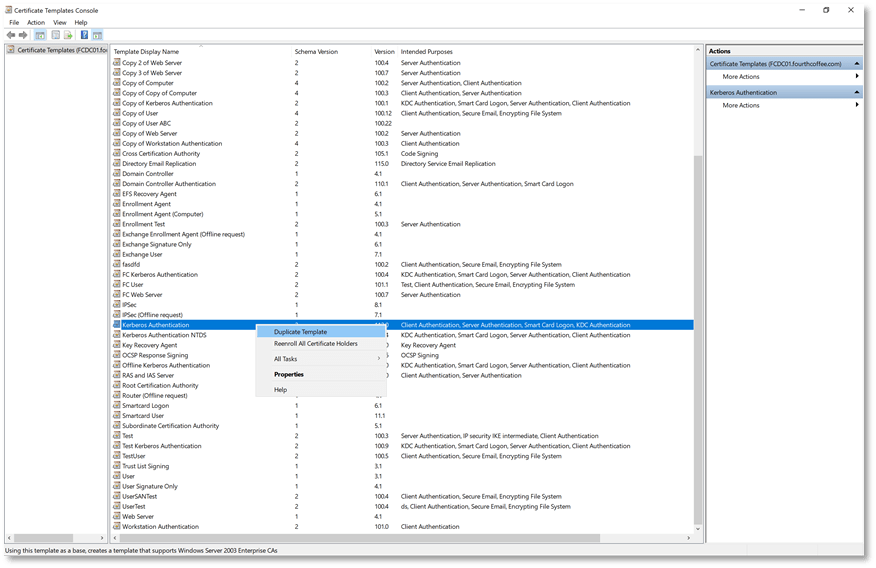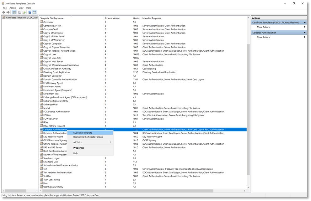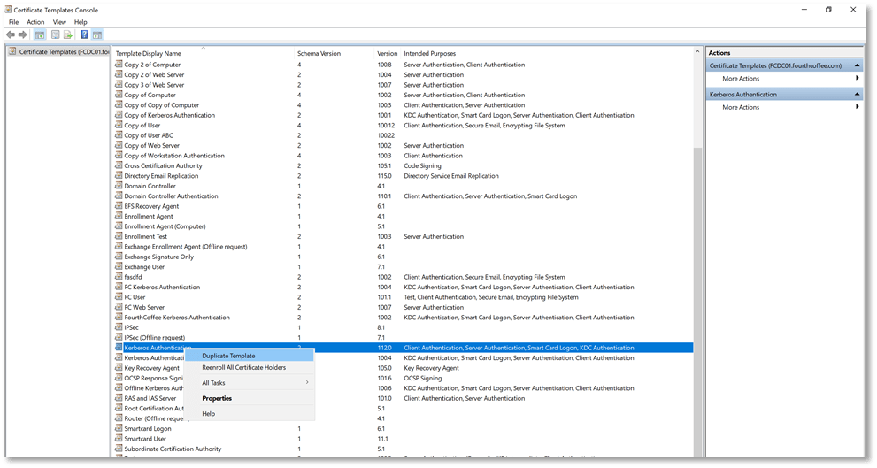 Step 4: Right-click on the Kerberos Authentication Certificate Template and select Duplicate Template