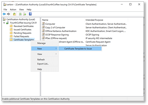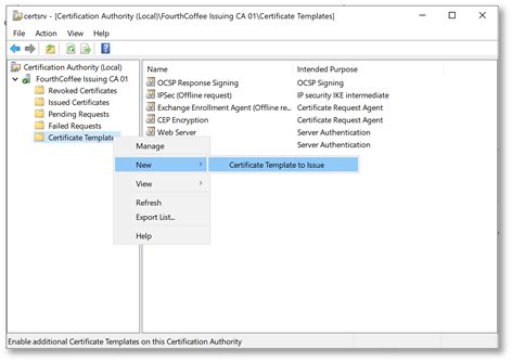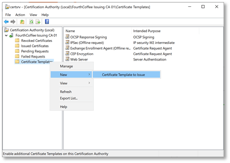 Step 13: Go to the Certification Authority MMC, and on the Certificate Templates container right-click and select New and then Certificate Template to Issue