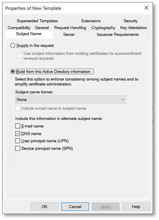 Additionally, the different templates come with a different Subject and SAN configuration. The table below displays the SANs available in the Certificate Templates. I am not concerned with the subjects, because applications like TLS will ignore the subject if the SAN is present and populated.