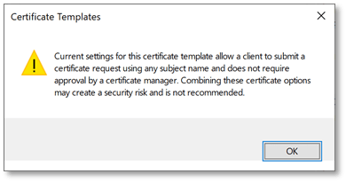 Step 11: When prompted about the security concerns, click OK. Note: From a security perspective you really should require Certificate Manager approval when allowing the requester to supply the subject name. The limitation is if we did that in this situation we would be unable to automatically renew the certificates. A mitigation could be to continually review issued certificates and make sure the identities requested make sense and do not violate any security policy.
