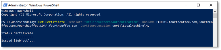 AN example would be: Get-Certificate -Template “OfflineKerberosAuhentication” -DnsName FCDC01.fourthcoffee.com,FourthCoffee.com,FourthCoffee,LDAP.fourthcoffee.com -CertStoreLocation cert:\LocalMachine\My