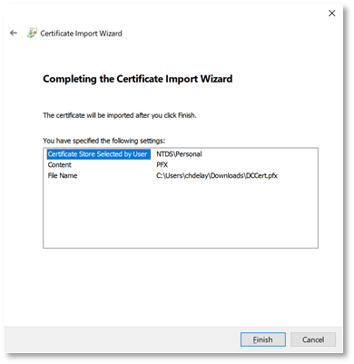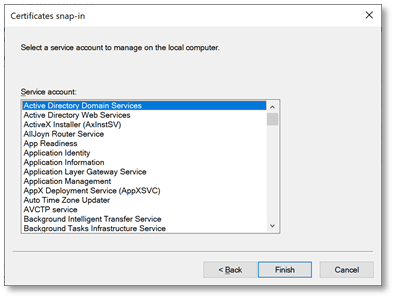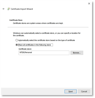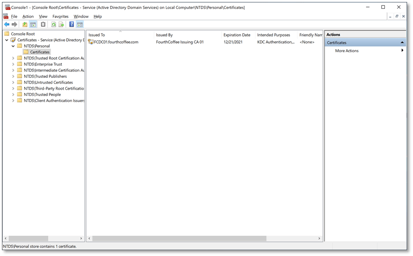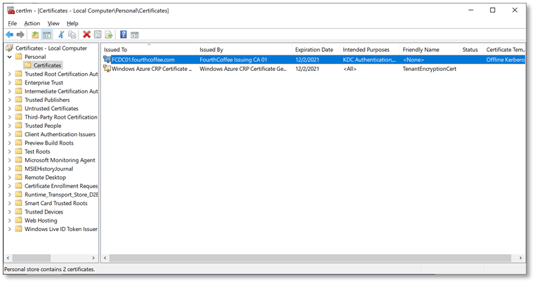 The LDAPS certificate is located in the Local Computer’s Personal certificate store (programmatically known as the computer’s MY certificate store).