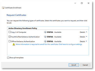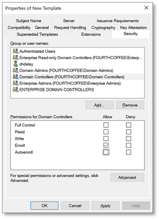So, if you are happy with the SANs that the Kerberos Authentication template provides, and you do not have Server Authentication certificates on any of your domain controllers. Then congratulations, you get to use the easiest option. The easiest option is deploying the Kerberos Authentication certificate template with Autoenrollment.