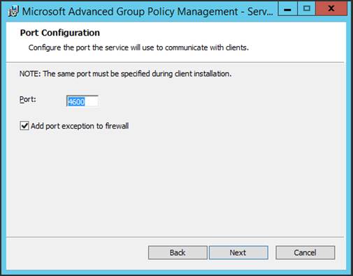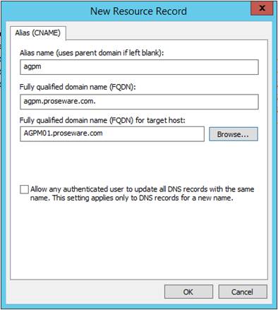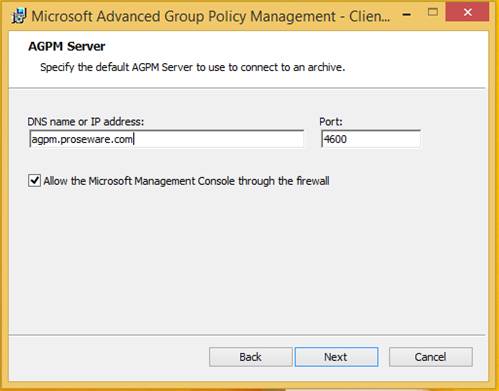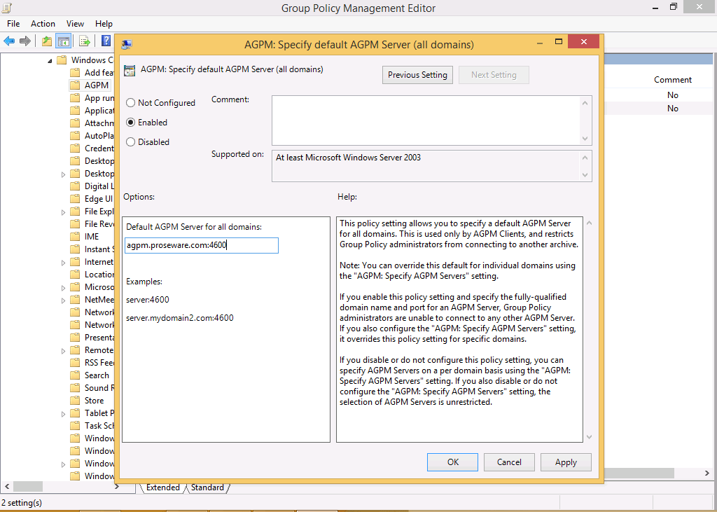 Open the setting AGPM: Specify default AGPM Server (all domains). Change the configuration Enabled. For the setting Default AGPM Server for all domains, enter the DNS Alias for the AGPM Server and the port number in the format <DNS Alias>:<Port Number>.