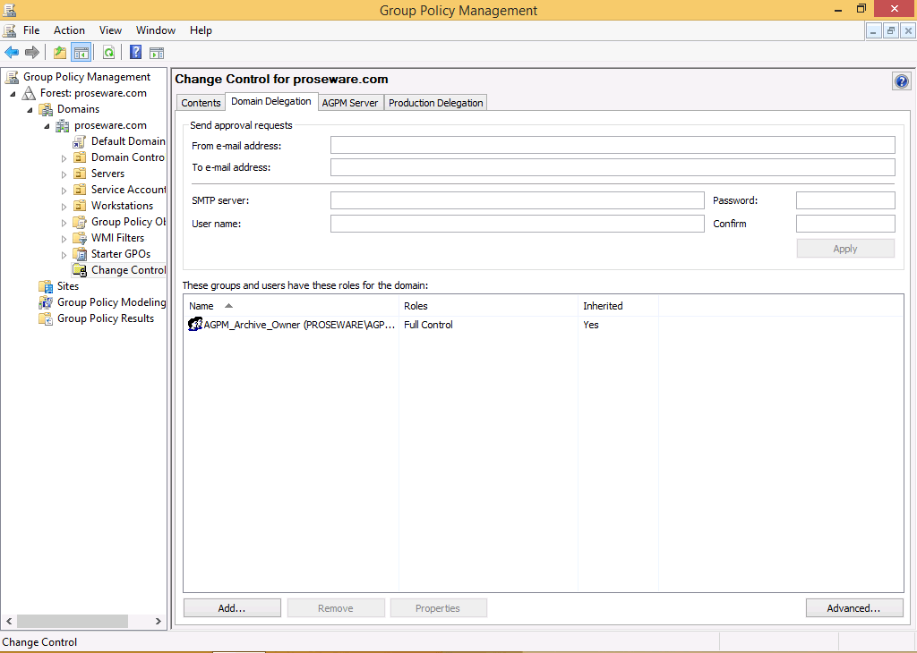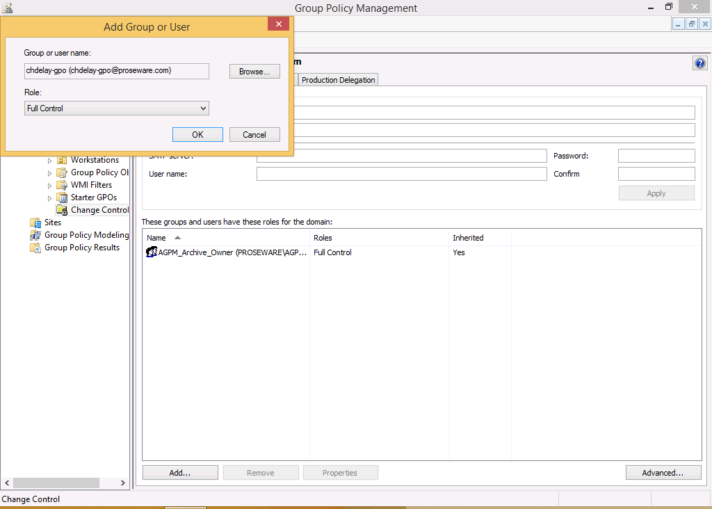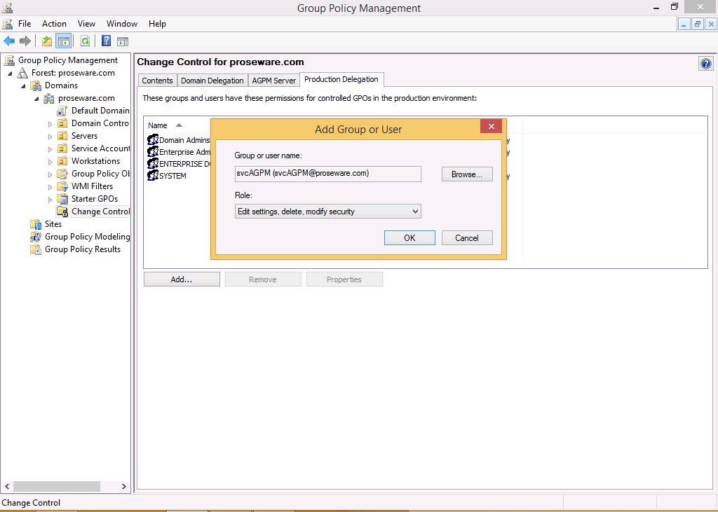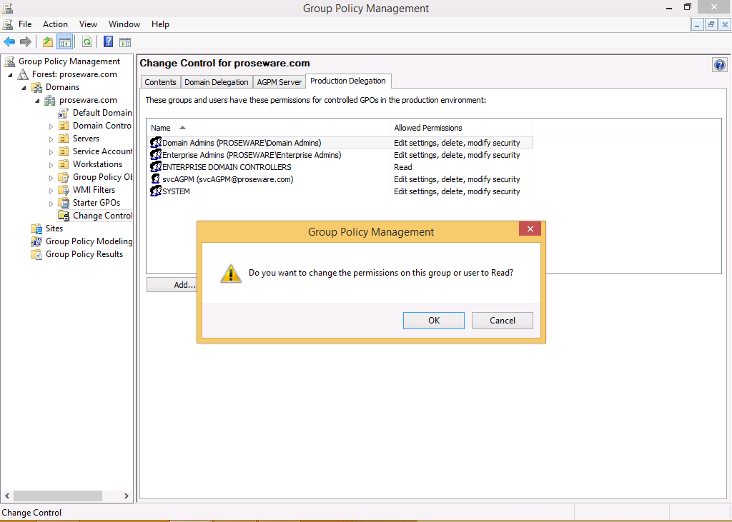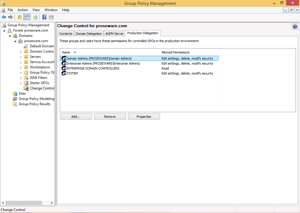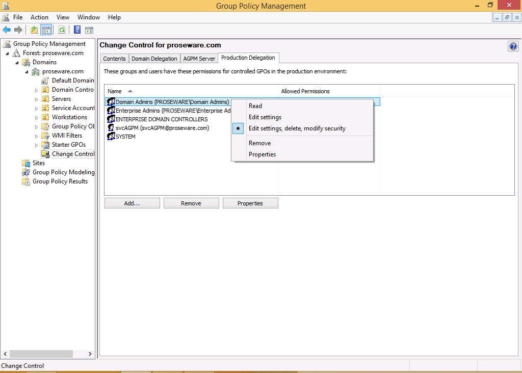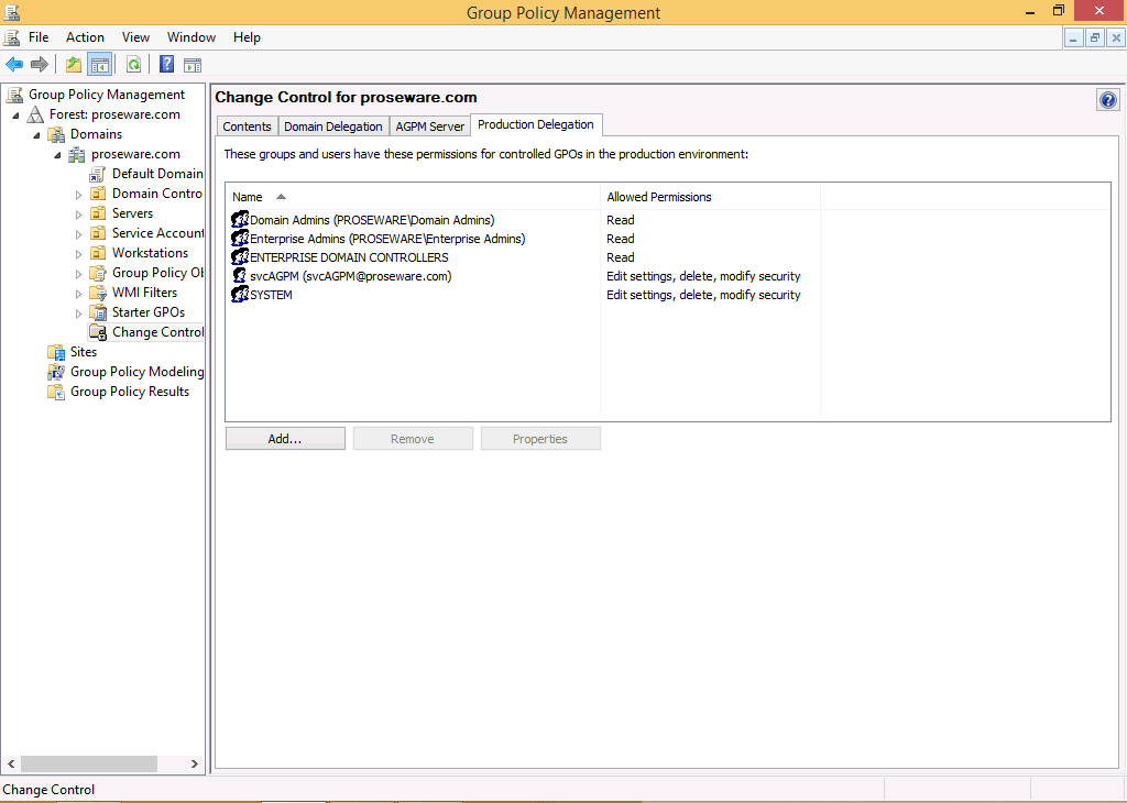 To ensure that the ability to modify GPOs is restricted to those that are provisioned access through AGPM, new GPOs that are created must have their permissions restricted. You will want to restrict the Production Delegation. To do this you will want to ensure that just the AGPM Service Account and System have the permissions: Edit settings, delete, modify security. All other accounts will need to either be removed or have their permissions changed to Read.