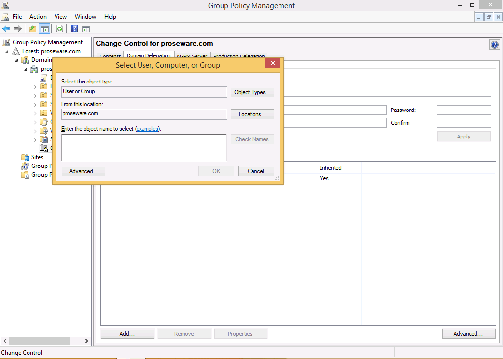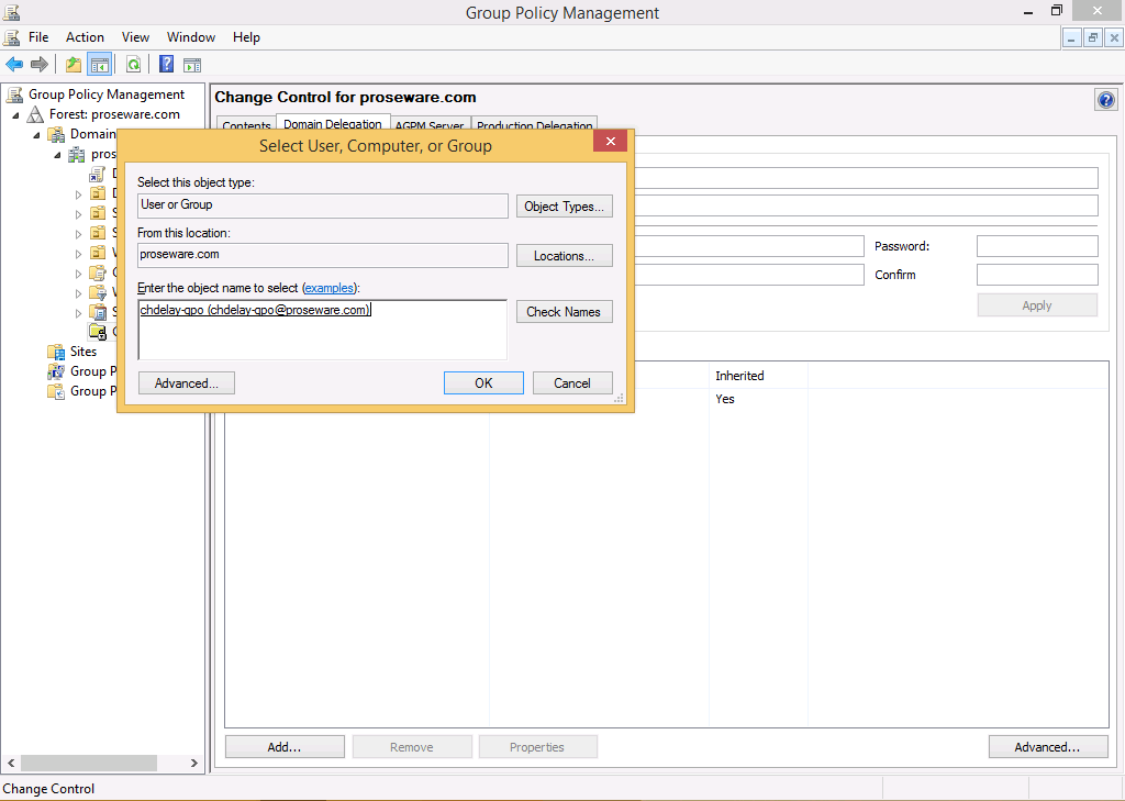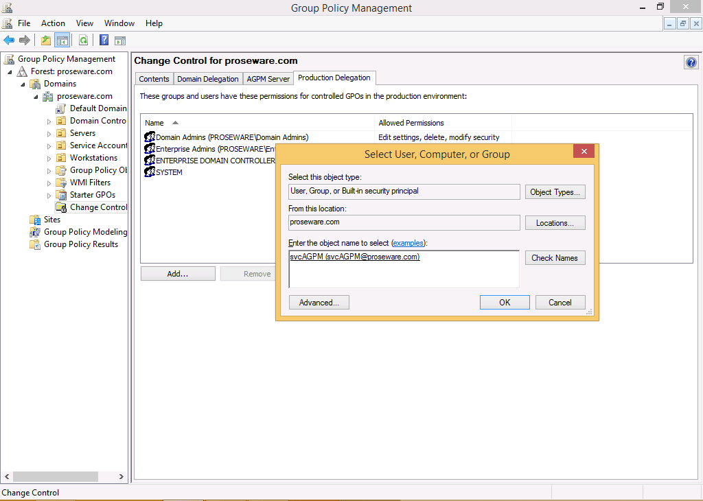 To add the AGPM Service account to the Production Delegation navigate to the Production Delegation tab. Enter the name of the Service Account. Then click Check Names to validate the account name. Then click OK.