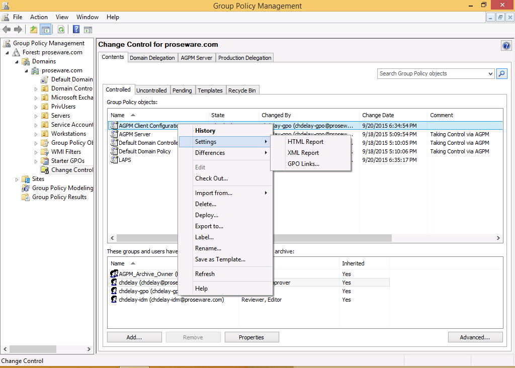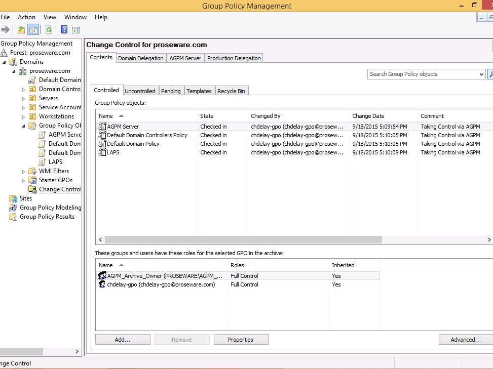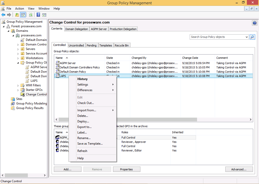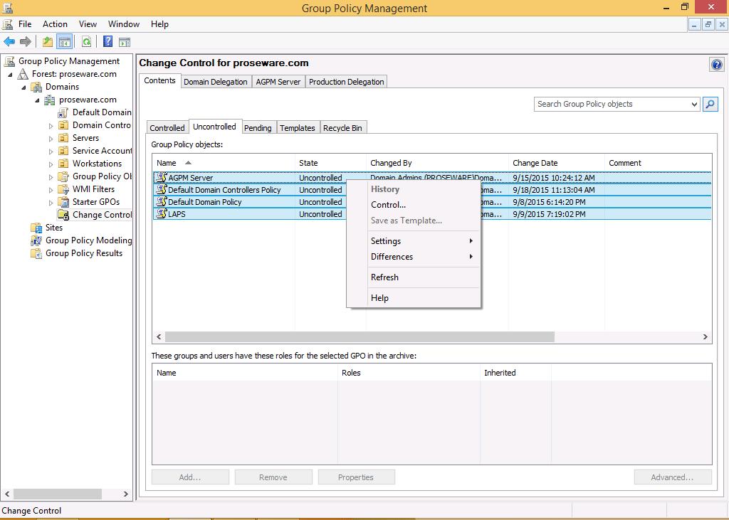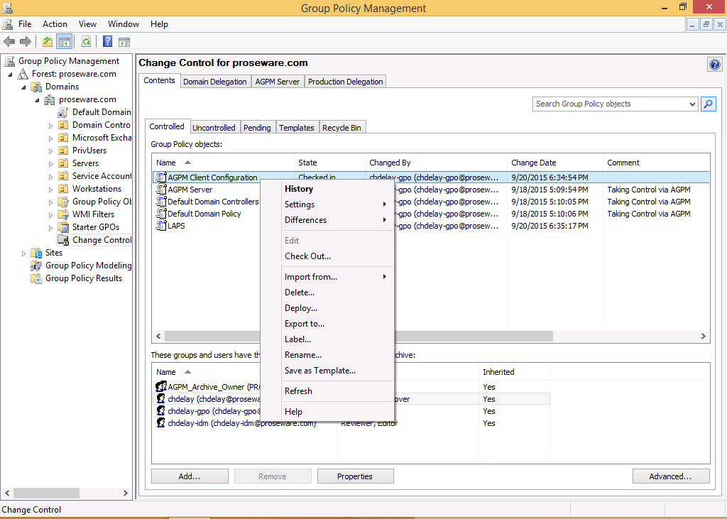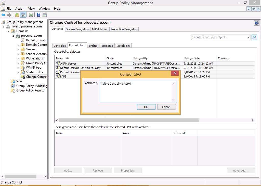 Once you have given the AGPM Service Account access to the GPOs, you can put them under Control of AGPM. Once the GPOs are under the control of AGPM, all group policy management can be done via AGPM. The following steps can be followed to take control of existing GPOs: