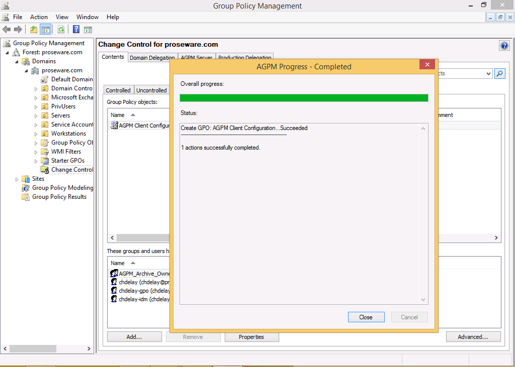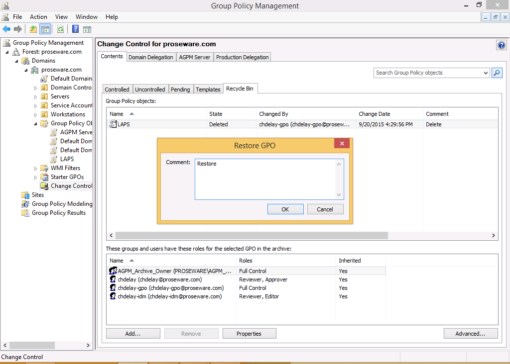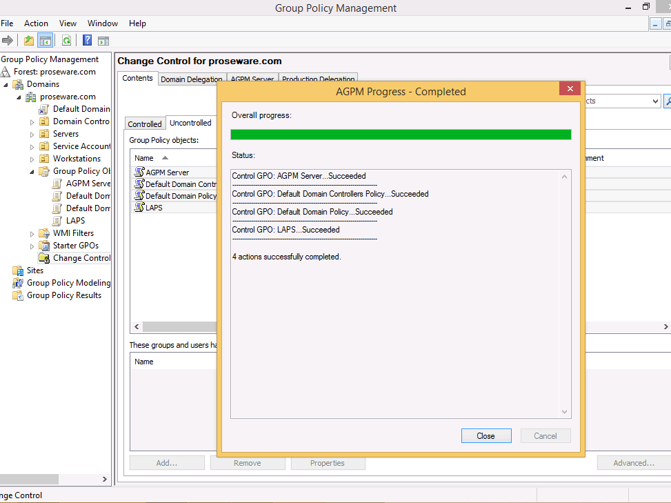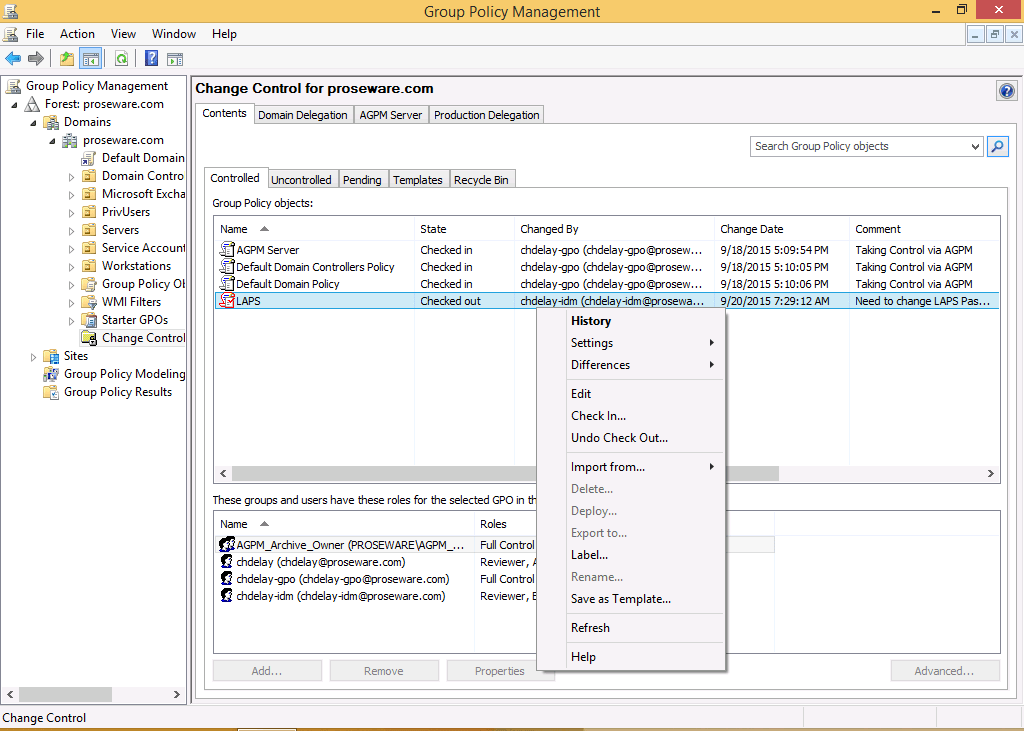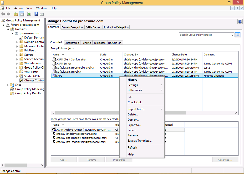 Once you have given the AGPM Service Account access to the GPOs, you can put them under Control of AGPM. Once the GPOs are under the control of AGPM, all group policy management can be done via AGPM. The following steps can be followed to take control of existing GPOs: