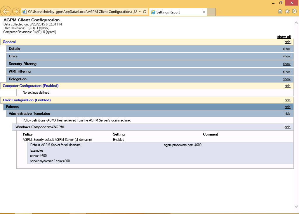 Within AGPM it is simple to view a settings report. If you right-click on the GPO, you can select the Settings from the context menu. You then have the option to view: