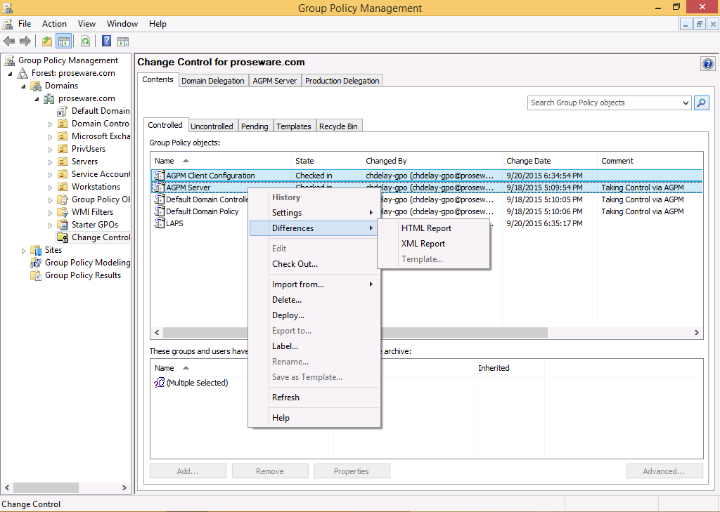 One of the more useful features of AGPM is the ability to compare two GPOs.