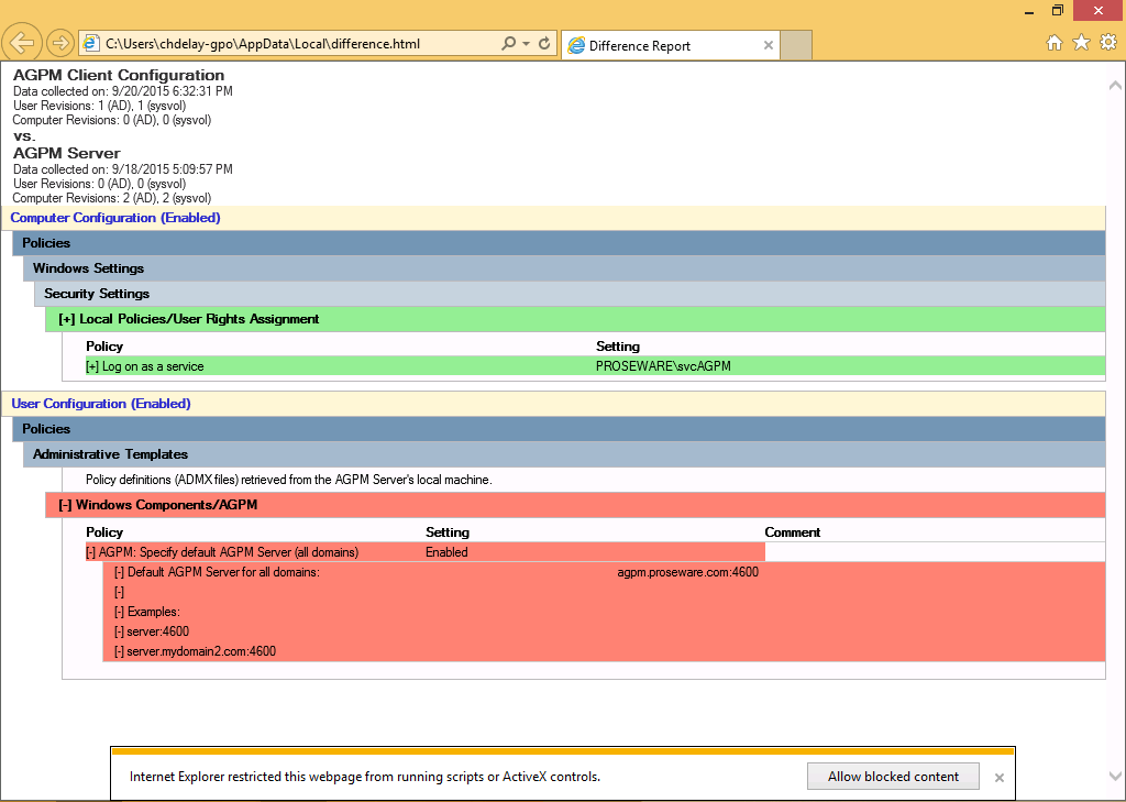 Below is an example of an HTML Report, highlighting the differences between the two GPOs.