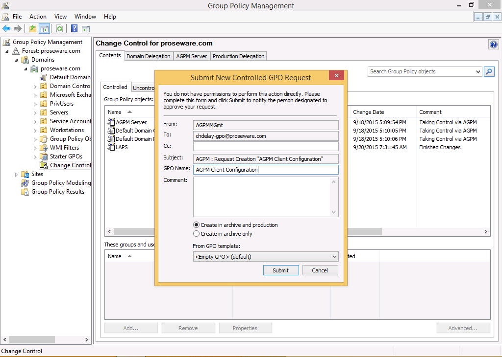 The Editor would then be prompted to Submit New Controlled GPO Request. The Editor would then fill out the form. The Editor has the option to Create in archive and production or Create in archive only. Also, the user can create the GPO from a Template. The Editor would click Submit to submit the request to the approver.