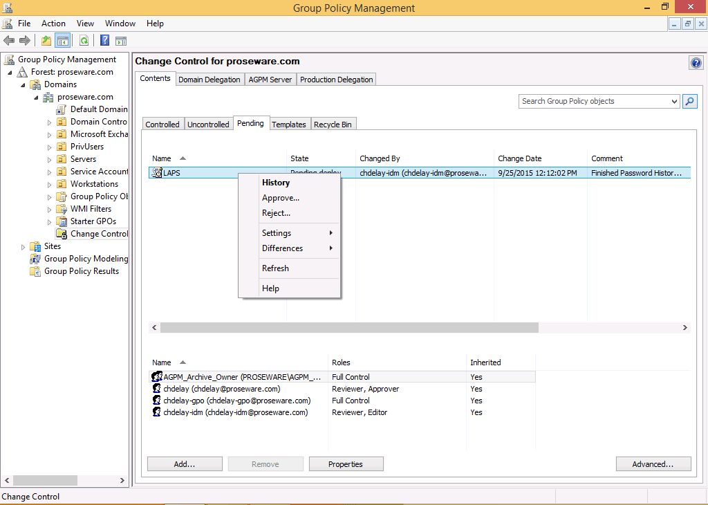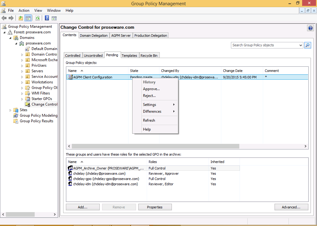 The Approver would then right-click on the GPO and the select Approve… from the context menu.