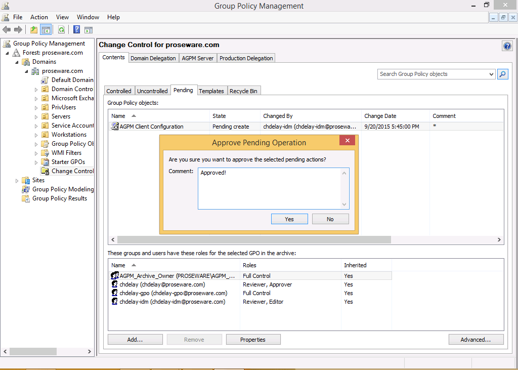 The Approver would then add a comment to the Approve Pending Operations dialog box, and click Yes.