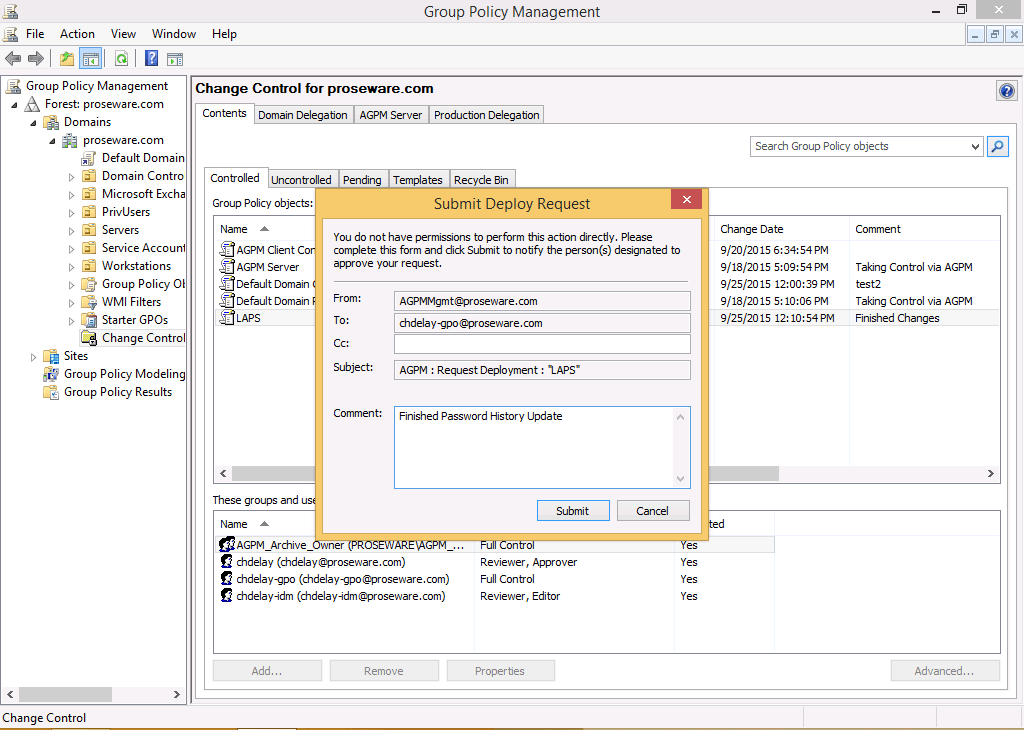 The Editor would then complete the Submit Deploy GPO form, in part to notify the Approver. Upon completion of the form the Editor would click the Submit button.