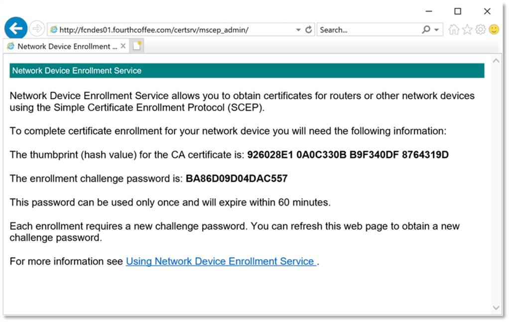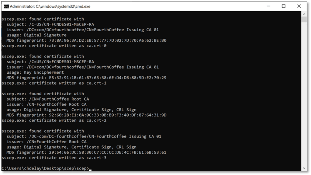 Step 7: To retrieve the CA certificate (which is part of the NDES enrollment process), run the following command: sscep.exe getca -u http://<your NDES server DNS Name or IP address here>/certsrv/mscep/ -c ca.crt