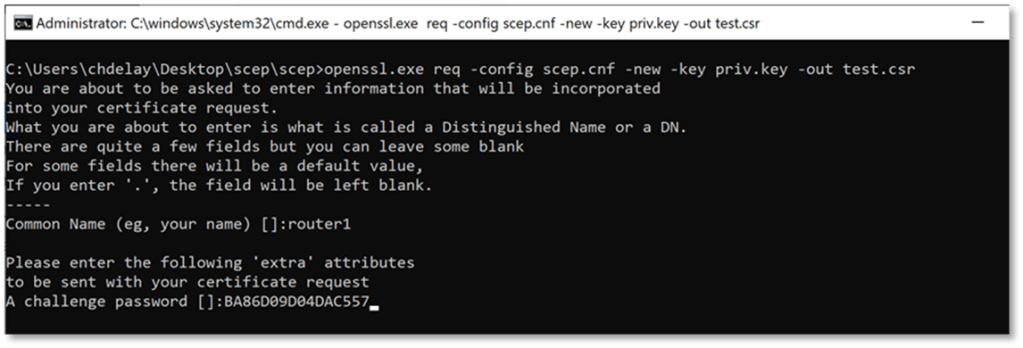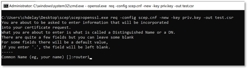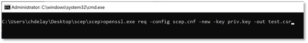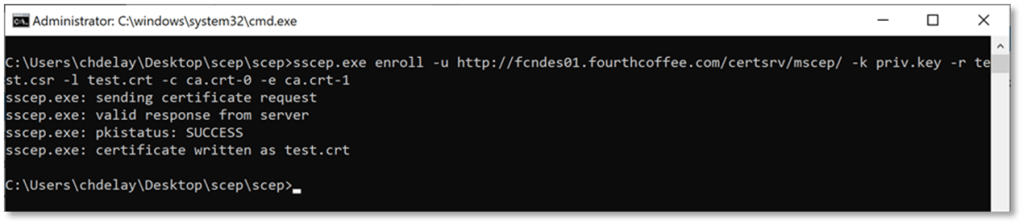 Step 8: Run the following command to enroll for the certificate: sscep.exe enroll -uhttp://<your NDES server DNS Name or IP address here>/certsrv/mscep/> -k priv.key -r test.csr -l test.crt -c ca.crt-0 -e ca.crt-1