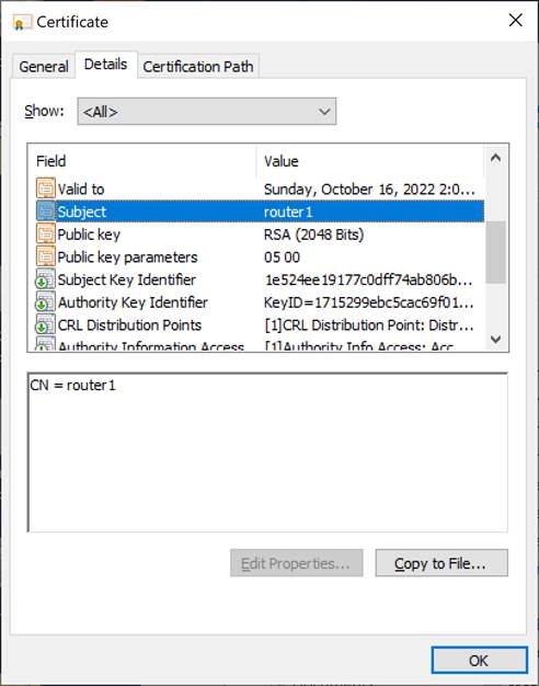 In the Details Tab you will see all of the fields listed in the certificate as well as some additional information supplied by the Operating System. We will discuss these fields in the next section. You can also use the Copy to File… button to export a certificate.