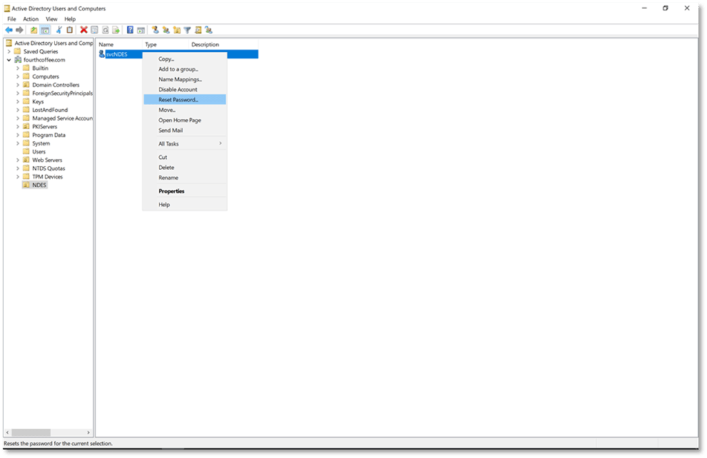 The following steps are the steps to reset the NDES service account password. This is pretty simple and straight forward.