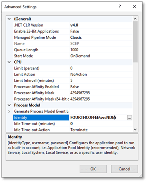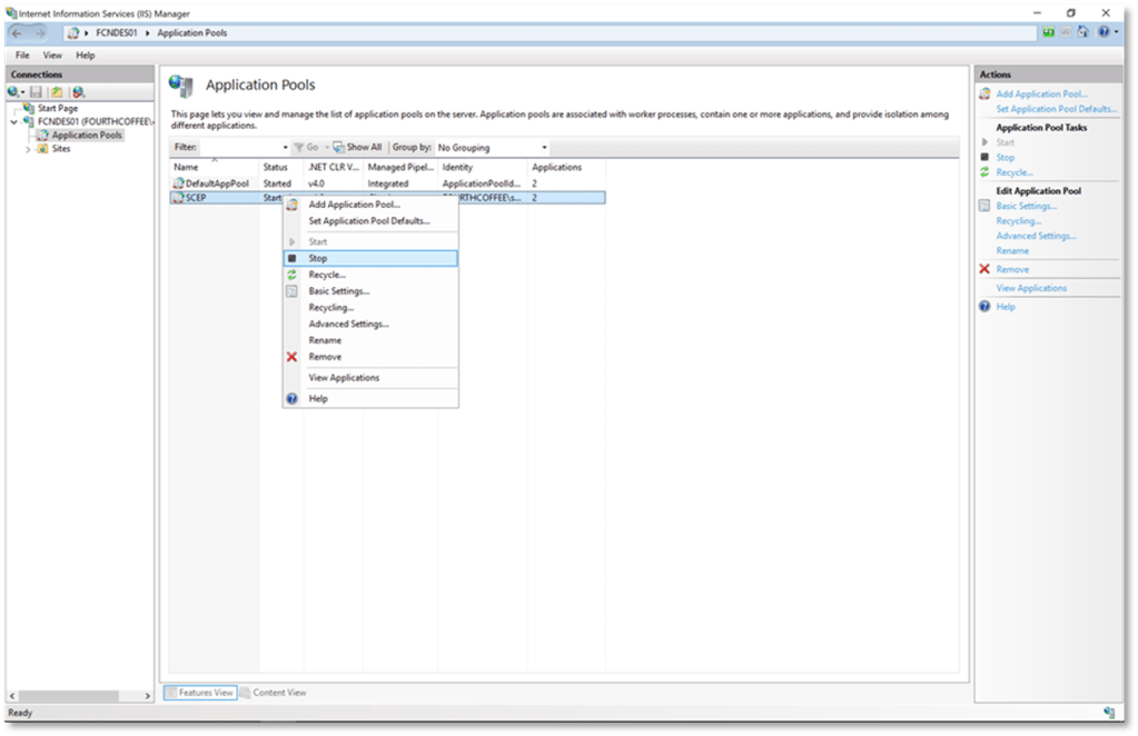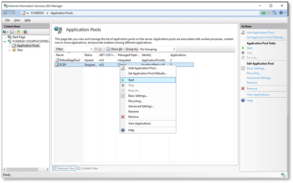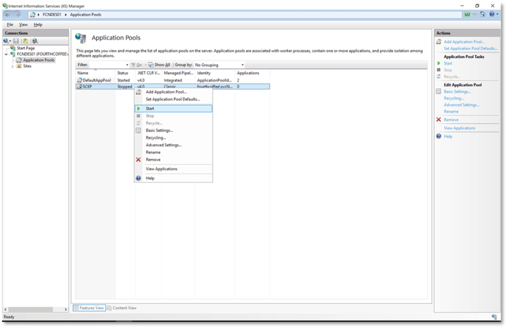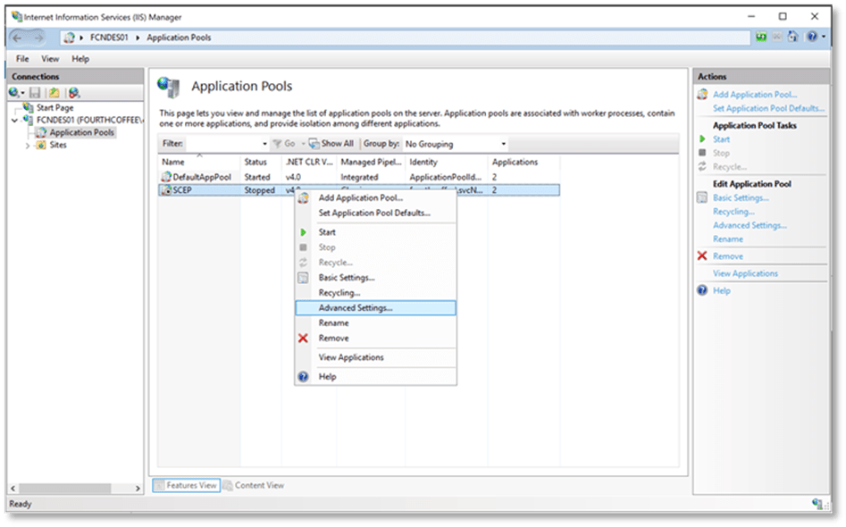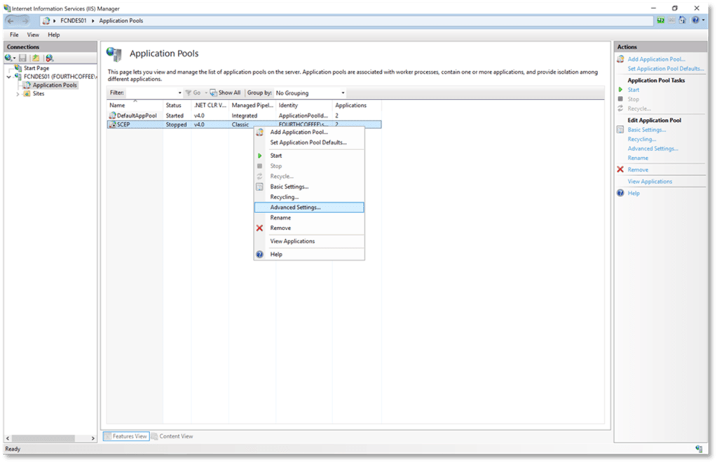 Step 10: Right-click on the SCEP application pool and select Advanced Settings…